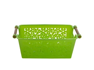 This Decorative Floral Storage Basket is perfect for organizing small items, serving as a stylish shower caddy, or simply enhancing your decor. Made from durable plastic, it features intricate cutout floral panels that allow for ventilation, wooden-look handles for easy transport, and drainage holes to keep contents dry.