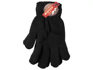 Keep your hand nice and toasty for the winter with these black gloves. These warm gloves will defiantly combine with any outfit. One size fits most. Comes packaged with a hanging tag. It is polyester blend with elastic cuffs for proper fitting.