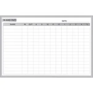 Manufacturing Dry Erase Board is visually enhanced to encourage communication and collaboration. Use boards anywhere in your manufacturing facility for tracking employee attendance with an In/Out board. Board graphics are specially designed to encourage communication between employees and managers by providing an easy way to exchange information. Whiteboard is easy to erase, allowing you to update information throughout the day. Board comes in a sleek, aluminum frame and includes a detached SmartPak tray. Graphics are produced in gray to seamlessly match any interior and will never stain, ghost or fade. Board includes a marker and eraser.