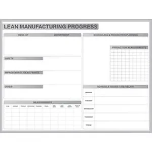 Manufacturing Dry Erase Board is visually enhanced to encourage communication and collaboration. Use boards anywhere in your manufacturing facility for tracking LEAN initiatives. Board graphics are specially designed to encourage communication between employees and managers by providing an easy way to exchange information. Whiteboard is easy to erase, allowing you to update information throughout the day. Board comes in a sleek, aluminum frame and includes a detached SmartPak tray. Graphics are produced in gray to seamlessly match any interior and will never stain, ghost or fade.
