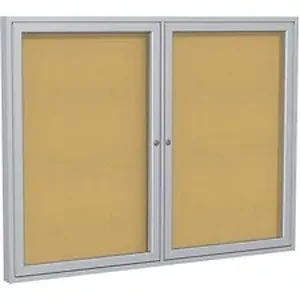 Enclosed cork bulletin board features two doors and anodized aluminum in a satin finish. The self-healing natural cork surface will hold up under the most demanding use to provide years of reliable service. Doors feature full-length hinges and shatter-resistant acrylic panels with flush-mount locks and four keys for added security. For indoor use, bulletin board also features concealed corner brackets for easy, secure mounting.