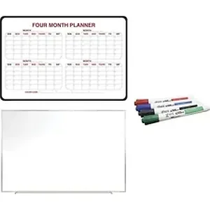 Designed for everyday use, Dry Erase/Bulletin Board Kit features high-quality communication tools that will fit perfect in a home office. Set includes one 36"x 24" four-month planner and one 36"x 24" dry erase board. Monthly planner is nonmagnetic with easily erasable surface and includes one marker and eraser. Whiteboard resists scratching, denting or staining and includes four markers in assorted colors. Use in your home office to make notes and write ideas or for children to encourage communication.
