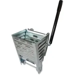 Squeeze wringer features a vented design with large drain openings to allow water to flow quickly into a bucket. Two-piece, tubular steel handle is able to support large amounts of pressure to thoroughly wring out wet mops. Large angle linkage system allows maximum force throughout the wringing cycle. High-quality, electroplated steel prevents rusting for long-lasting use.