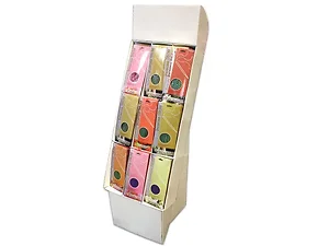 This visually appealing floor display showcases a diverse assortment of 144 incense packages, featuring 9 unique and delightful scents: Wild Flower, Strawberry, Sandalwood, Jasmine, Violet, Frankincense, Vanilla, Patchouli, and Rose.