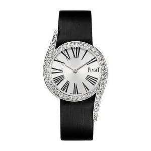 Piaget GOA38160 Limelight Gala Silver Diamond Dial Satin Ladies Watch Piaget's newest watch for ladies can be expressed in three words: radiant, spirited and seductive. It takes the linearity out of time, placing it instead on a curve of pure femininity. Its round 32 mm case is enhanced by two elegant elongated horns and the voluptuousness of its curves is highlighted on the bezel by a line of graduated round diamonds. The pure appearance of its dial results in a very contemporary, yet classic allure, with its black Roman numerals that are in unison with the refinement of its satin strap. Features: Brand: Piaget Diamond watch - white gold Watch product type: Watch Metal: White Gold Metal weight: 40 g Strap type: Satin Strap colour: Black Strap buckle: Ardillon buckle Case shape: Round Case diameter: 32 mm Case thickness: 7.4 mm Dial colour: Silvered Index: Roman numerals Waterproofness: 03 ATM Movement: Quartz Precious stones: Diamond