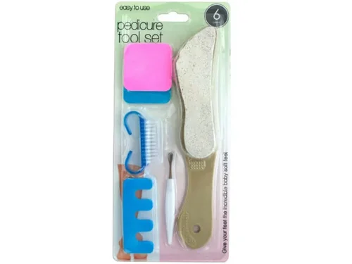 Easily prepare your toes for polish with this 6-piece Pedicure Tool Set featuring a 9" pumice foot file, 2.5" nail cleaning brush, 2 - 2" x 2" emery squares, 3.75" cuticle pusher and a 3.125" toe separator. Comes in assorted colors. Comes packaged in a blister pack.