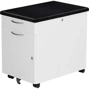Personal storage unit offers convenient storage for the varied things you need to work. Lift the top to access the landing pad for your devices and a storage well for your backpack, purse, gym bag and more. A file drawer and concealed personal drawer can help with the incidental filing and storage. An additional wheel on the front drawer prevents tipping for safe use. A grommet is located in the top back of the cabinet to allow wires to pass through. With an optional side-bin (sold separately) for active documents, this storage unit offers space for all of your important papers.