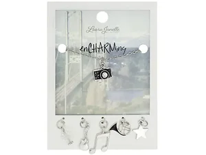 Elevate your jewelry collection with our Charming Camera Necklace! This unique piece features a stylish silver chain adorned with a central black camera charm, exquisitely complemented by five interchangeable silver charms: a diamond, a guitar, a music note, a trumpet, and a star.