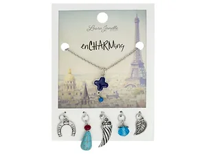Attached to a sturdy silver chain, this interchangeable charm set includes five additional silver and blue charms: a silver horseshoe for good luck, a blue stone topped with a petite red gem for a pop of color, a silver 'tooth' charm for a whimsical touch, a smooth blue stone, and a delicate silver leaf charm that adds a touch of nature-inspired elegance.