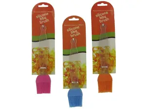 With its innovative design and silicone bristles, this barbecue brush is perfect for outside and stove top grills. Keep beef, poultry, or fish moist by mopping with sauces and marinades. Brushes are easy to clean and are heat resistant up to 500 degrees. Measures approximately 8" long. Comes packaged to a tie card in a hanging poly bag.