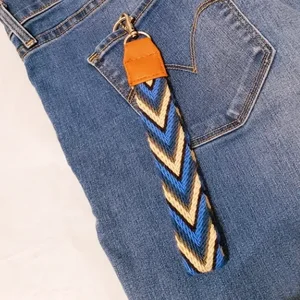 This handcrafted key chain is a unique piece created by our talented Wayuu artisans, showcasing traditional craftsmanship in exquisite blue. Made with care and finished with durable vegan leather, each keychain measures 23 cm (9 in) from the bolt snap to the end of the Wayuu strap.