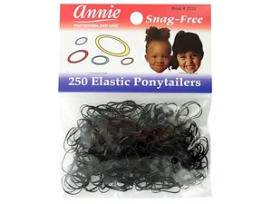 This set of 250 Premium Snag-Free Black Elastic Hair Bands is designed for all hair types. The small, durable plastic bands are created to ensure they won't snag or pull on hair, making them perfect for everyday use. Each band measures approximately 3/4" long and is designed to hold hair securely without causing damage.