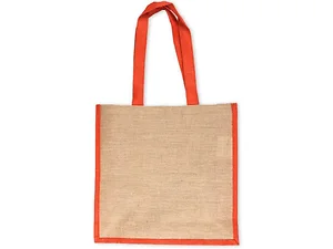 This orange and natural jute shopping tote bag measures 4" x 14" x 4" and is perfect for gift bags and favor bags. Made from 100% jute burlap fabric, it features a protective coating on the inside, ensuring sturdiness and durability. Ideal for daily use, this tote bag is as functional as it is stylish. It comes packaged loose for easy accessibility.