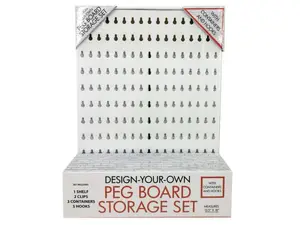Transform your storage solutions with the Customizable White Peg Board Organizer. This versatile set allows you to personalize your storage for jewelry, notes, sunglasses, and more. It includes one sturdy shelf, two clips, three containers for various items, and five hooks for hanging accessories. Ideal for small shops or personal use, this peg board measures approximately 13.5" x 18" and is crafted from durable plastic. It's thoughtfully packaged shrink wrapped in a wrap-around box, making it perfect for gifting or immediate use.