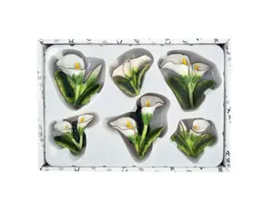 Enhance your home decor with the Elegant Calla Lily Magnets Collection. This beautiful 6-piece set features intricately designed, hand-painted resin magnets inspired by the graceful calla lily. Perfect for adding a touch of nature to your refrigerator, these magnets come in various sizes, ranging from approximately 2.25" x 2" to 3" x 3.25".