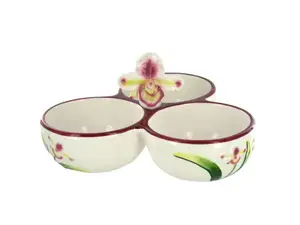 Enhance your entertaining experience with the Hand-Painted Orchid Ceramic Dip Bowl Set. This exquisite trio features three connected ceramic bowls adorned with beautiful raised hand-painted orchids, complemented by a vibrant orchid centerpiece and elegant red accents along the rims.