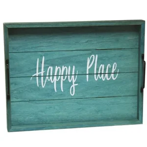 Add a touch of elegance to your home with this chic blue wash wooden serving tray. Featuring sturdy black metal handles and a delightful 'Happy Place' message, this tray is perfect for a cozy farmhouse aesthetic.