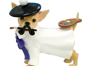 Introducing the Whimsical Chihuahua Artist Figurine, a must-have for dog lovers and art enthusiasts alike! This charming figurine showcases a delightful painted resin Chihuahua, complete with an artist's hat and shirt. With a paint palette perched on his tail and a paintbrush held in his mouth, this little artist is sure to bring a smile to your face.