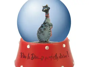 This stylish cat water globe is a must-have for cat lovers! Featuring a whimsical design, it showcases a slender, stylized cat with a charming checkered coat nestled inside a glitter-filled globe. The base, adorned with sparkling rhinestones, is painted red and is inscribed with the phrase "Viva la diva...So purrfectly divine!".