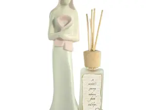 Enhance your space with the 'Survivor' Ceramic Reed Diffuser, a beautiful symbol of strength and hope. This elegant diffuser showcases a white ceramic figurine of a woman gracefully holding a pink ribbon, accompanied by a glass scent bottle that reads, "A survivor's journey embraces faith and hope."