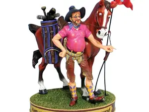 Brighten up your decor with the Ranch Hands 'Putter Covered' Figurine. This whimsical resin piece showcases a man and his horse adorned with golf gear, standing proudly on a base that humorously reads, "Keep your balls clean and your putter covered!"