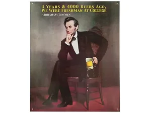 Enhance your space with this eye-catching '4 Years & 4000 Beers' Metal Wall Sign. The sign showcases a textured print of Abraham Lincoln raising a beer and features the amusing quote: "4 Years & 4000 Beers Ago, We Were Freshman at College - Abraham Lincoln".
