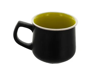Enjoy your favorite hot beverages in style with this 14-Ounce Matte Black and Yellow Elf Ceramic Coffee Mug. Its sleek, tapered design features a matte black exterior and a glossy golden yellow interior, accented by a glossy white stripe along the rim. The mug is designed with a comfortable handle for a secure grip, making it perfect for sipping your morning coffee or evening tea. This mug is sold individually without packaging.