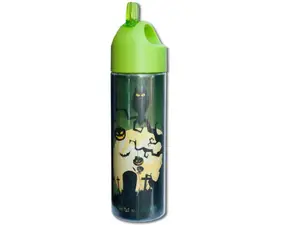 This vibrant 15 oz. Halloween Themed Water Bottle is designed for both cold and hot liquids. Constructed from clear double wall Tritan plastic, it showcases a decorative green Halloween theme insert, making it a fun accessory for the spooky season. The bottle features a lime green screw-on lid with a convenient folding spout for easy pouring.