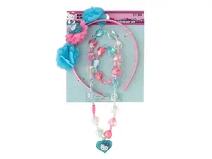 Embellished with lovely cloth flowers and a sparkling glitter heart Hello Kitty charm, the headband adds a magical touch to any outfit. The set also includes a stretchy necklace and bracelet adorned with iridescent plastic heart beads, making it a perfect accessory for young fans of Hello Kitty.
