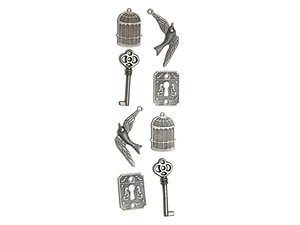 Enhance your creative projects with the Antique Silver Bird Cage Craft Stickers Set. This collection features eight unique metal embellishments in various bird cage designs, each showcasing intricate embossed details. With their adhesive backs, these stickers are easy to apply and make a perfect addition to scrapbooking, card making, and other craft endeavors.