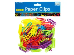 Great for holding paper together and craft projects, these Jumbo Colored Plastic Paper Clips feature extra large clips made of durable plastic in assorted bright colors. Clips measure approximately 2.125" long x 0.75" wide. Includes 144 pieces. Comes packaged in a poly bag with a header card.