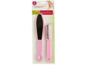 Ideal for removing dead skin, calluses and smoothing rough areas from sides and bottom of feet, this 2-piece Foot Smoother Set comes with a plastic double-sided file and a steel rasp with plastic handle. Instructions for use and care are on back of card. File measures approximately 8 1/2" long, rasp measures 6 1/2" long. Comes in assorted colors. Comes packaged in a blister pack.