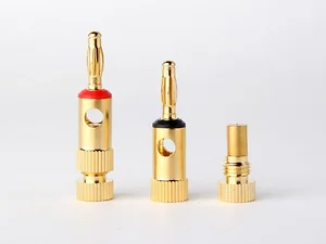 This high-quality gold plated 4mm banana speaker connector is designed for superior audio connectivity. It features both rear and side cable entry, allowing for flexibility in wire configurations. Ensure optimal performance in your audio setup with these reliable and easy-to-use connectors.