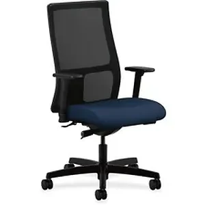 Mid-back work chair is designed to provide comfortable support for those who spend more than half the day at their desk or computer. Breathable mesh back delivers responsive seating for exceptional comfort. Arms adjust in height and width to adapt to various body sizes. Functions with simple, understandable controls include pneumatic seat-height adjustment from 17-1/2" to 22" high from the floor, seat-glide mechanism, back-height adjustment, 360-degree swivel, dual-action synchro tilt, and tilt tension. Synchro-tilt allows the back to recline twice as fast as the seat. As the back reclines, the seat remains relatively level, promoting leg circulation and ergonomic function. Design also features Centurion navy fabric upholstery on the seat, a five-star base and swivel casters. Weight capacity is 300 lb. Mid-back chair meets or exceeds applicable ANSI/BIFMA standards.