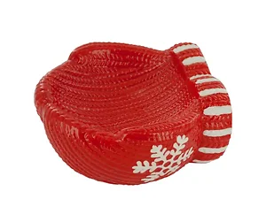 Enhance your holiday celebrations with this delightful Ceramic Mitten Candy Dish. Crafted in the shape of a cheerful red mitten, it features a charming cable knit texture along with white snowflakes and striped accents that add a festive touch to your table setting.