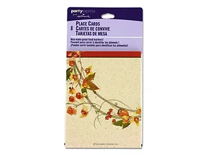This set of 8 Hallmark place cards features a charming autumn bittersweet wreath design. Perfect for identifying tables for food, drinks, or guests, these peach-colored cards showcase an elegant autumn branch on the front and a plain white reverse side. Each card measures 3 1/2" x 2 1/4" when folded. They are conveniently packaged shrink-wrapped and carded.