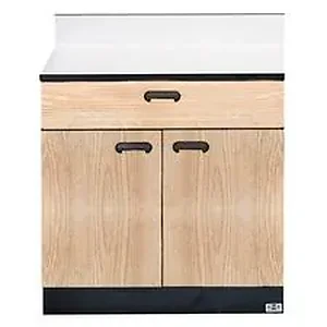 Treatment cabinet features high-pressure laminate top. The one laminate drawer moves on nylon-rollers for smooth opening and closing. The all-laminate interior includes one shelf.