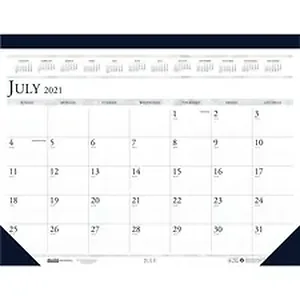 Academic desk pad calendar offers a one-page-per-month format and ranges 14 months from July to August. Each sheet is perforated at the top for easy removal. Each spread includes ruled daily blocks (2-1/2" x 1-5/8"), Sunday-through-Saturday scheduling, count of days/days remaining, holidays, and a 12-month reference across the top. Planning pages are bound at the top and printed in deep blue and gray. Nonrefillable desk pad calendar offers blue, simulated leather binding at the top and two vinyl corners at the bottom to hold pages in place.
