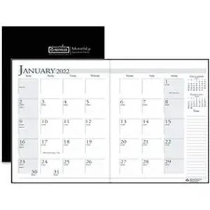 Monthly planner features a stitched, black leatherette cover to protect your planning. Planning pages range 14 months from December to January. Two-page-per-month spreads include large, unruled daily blocks (1-1/2" x 1-1/4"); holidays; count of days/days remaining; Sunday-through-Saturday scheduling; a ruled notes area along the side; and past and future months reference near the top right corner. Nonrefillable planner contains paper made with a high percentage of recycled material.