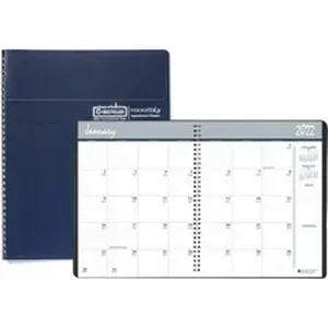Wire-bound monthly planner features a two-piece, embossed, simulated leather cover for a professional look. Planning pages range 14 months from December to January. Two-page-per-month spreads include large, ruled daily blocks (2-1/8" x 1-7/8") for detailed notes, holidays, count of days/days remaining, Sunday-through-Saturday scheduling, a ruled notes area along the side, and past and future months reference near the top right corner. Nonrefillable planner is printed with soy ink on paper made with a high percentage of recycled material.
