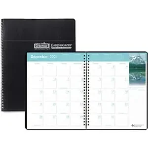 Wirebound monthly planner features a full-color nature scene and inspirational quote to enhance your planning. Dated planning pages range 14 months from December to January. Each two-page-per-month spread offers daily blocks (2-1/8" x 1-7/8"), a ruled notes section, Sunday-through-Saturday scheduling, count of days/days remaining, holidays and past, current and three future months reference at the top. Cover is made of embossed, simulated leather. Nonrefillable monthly planner contains a high percentage of recycled material.