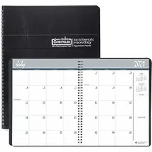 Wirebound monthly planner offers basic academic planning to keep your year on track. Dated planning pages range 14 months from July to August. Each two-page-per-month spread offers faintly ruled daily blocks (2-1/8" x 1-7/8"), a notes section, Sunday-through-Saturday scheduling, count of days/days remaining, holidays, and past and next months reference at the side. Cover is made of embossed, simulated leather and includes a three-year calendar reference in the back. Nonrefillable monthly planner contains a high percentage of recycled material.