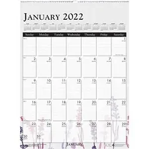 Enhance any office decor with this Soothing Wild Flower Wall Calendar. Each month has a different illustration of a wildflower. Dated planning pages range 12 months from January to December. Recycled spiral binding includes a convenient hanging loop for easy hanging and makes it easy for you to refer to future and previous months. Chipboard backer offers a durable writing surfaces and lets calendar hang flat. One-page-per-month format features ruled daily blocks (2" x 1-2/3") from Sunday to Saturday, count of days/days remaining, numbered weeks, U.S. and Canadian holidays as well as a full-year reference calendar at the top. FSC certified, recycled paper is printed with soy ink.