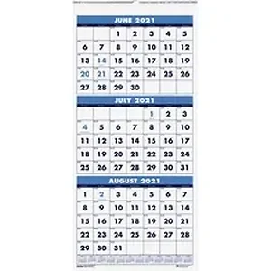 Three-month wall calendar is the perfect size for cubicle areas. Design is vertical and compact so you can hang it in space-limited areas. Large numbers can be seen from a distance. Dated planning pages range 14 months from June to July. Each page features three months in equal size - previous, current and future. This one-page-per-three-month format includes two-color printing, unruled daily blocks (1-1/6" x 1"), holidays highlighted in blue, Sunday-through-Saturday scheduling, and a full-year reference calendar at the bottom. Nonrefillable calendar features wire binding with a hanger. Wire binding and calendar pages contain a high percentage of post-consumer recycled material.