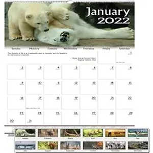 Wall calendar features a wildlife photo and inspirational quote on each month. Dated planning pages range 12 months from January to December. One-page-per-month format includes unruled daily blocks (1-5/8" x 1-5/8"), Sunday-through-Saturday scheduling, full-year calendar reference and count of days/days remaining. Wire binding includes an eyelet for easy hanging. Wall calendar is printed with soy ink on paper made with a high percentage of recycled material.