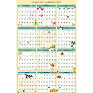 Recycled Seasonal Laminated Erasable Wall Calendar depicts each month's special holiday and season with bright lively designs on a full-year view. Reversible design shows four months across on the horizontal side and three across on the vertical side for a quarterly approach. Laminated, write-on/wipe-off surface easily erases with a damp cloth for changing plans. Each month features 1" x 1/2" daily blocks with count of days/count of days remaining for easy tracking. Holidays highlighted with a different color date as quick reminder. Calendar is printed on post-consumer, FSC certified recycled paper with soy-based inks. Hang with included four peel-and-stick tabs. Calendar also comes with a black water-soluble marker.