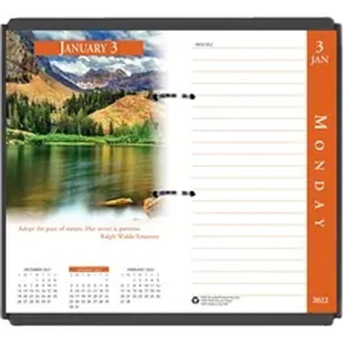 Desk calendar refill offers a colorful way to refill your standard, No. 17 calendar base. Each weekday displays a full-color photo and a quotation. These two-page-per-weekday spreads also feature past, current and future monthly calendar references under the photo and a full second page of unruled space for planning your day. Saturday and Sunday each occupy a page. Planning pages range 12 months from January to December. FSC certified calendar pages contain a high percentage of post-consumer recycled material.