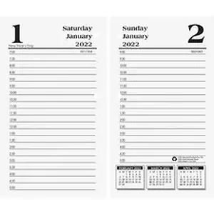 Calendar refill offers a simple way to refill your standard, No. 17 calendar base. Dated planning pages range 12 months from January to December. Weekdays offer two-page spreads with ruled, half-hour appointment times from 7 AM to 5 PM; count of days/days remaining; holidays; and past, current and future monthly calendar references. Saturdays and Sundays get one page each and still feature ruled appointment times. FSC certified paper contains a high percentage of post-consumer recycled material.