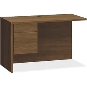 Left return with 3/4 pedestal is a part of HON 10500 Series Wood Laminate Furniture. To create an L-shaped layout, use with the 10500's right-pedestal desk. It can also be used with desk shells, peninsulas and corner units. Left return with formal, full-height modesty panel features one box and one file drawer. Locking drawers offer five-sided construction for easy drawer alignment. Interchangeable, core-removable lock makes rekeying quick and easy. Box drawer operates on ball-bearing suspension with 3/4 extension. File drawer extends fully on ball-bearing suspension. Included hangrails are designed for side-to-side letter-size or legal-size filing and front-to-back letter-size filing. Top and end panels are made with durable, thermal-fused laminate over durable, 1-1/8" thick, solid-core high-performance particleboard and resist warping, scratches and stains. One-cord, pass-through, 3" grommet in the top is designed to reach electrical wall outlets while routing wires and cables.