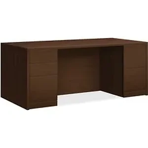 Double-pedestal desk belongs to the HON 10500 Series Wood Laminate Furniture, a versatile collection for any office arrangement. Smooth, flat edges and a full modesty panel deliver a clean, streamlined look. Scratch-resistant, spill-resistant and wear-resistant, Mocha laminate on strong inner-frame construction assures trouble-free performance and long life. Desk features two full pedestals with five-sided drawer construction for added strength and easy alignment. One pedestal includes two box drawers for supplies and one file drawer for filing. The other pedestal includes two file drawers. All file drawers include integrated hangrails for side-to-side letter-size and legal-size hanging folders and front-to-back letter-size filing. Drawers operate on full-extension, ball-bearing suspension. Desk also has interchangeable, core-removable lock for quick, easy rekeying and two 3" round grommets to route and hide wires and cables. Center drawer for the desk is sold separately.